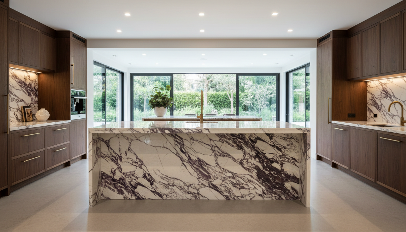 Most homeowners utilize Calacata Viola marble for high-impact surfaces like kitchen islands and backsplashes. A book-matched backsplash, where two slabs mirror each other, creates a stunning visual rhythm that functions as permanent wall art. This application elevates the entire kitchen, making it the undeniable heart of the home.