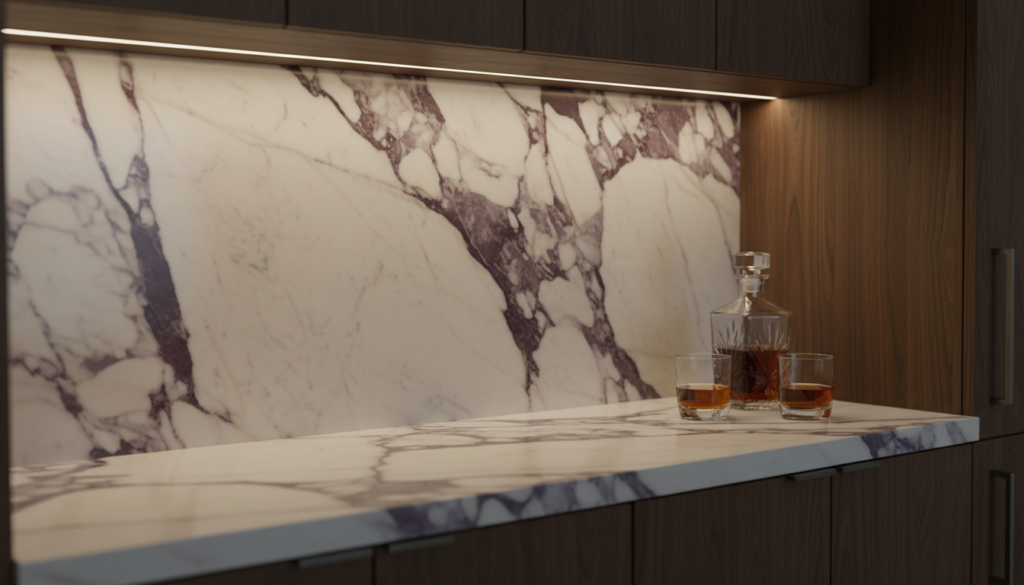 For those who find classic white too safe, Calacata Viola is the answer. This trending Italian marble features a creamy white background struck through with bold, dramatic veining in deep wine and burgundy tones. It’s not just a surface; it’s art.